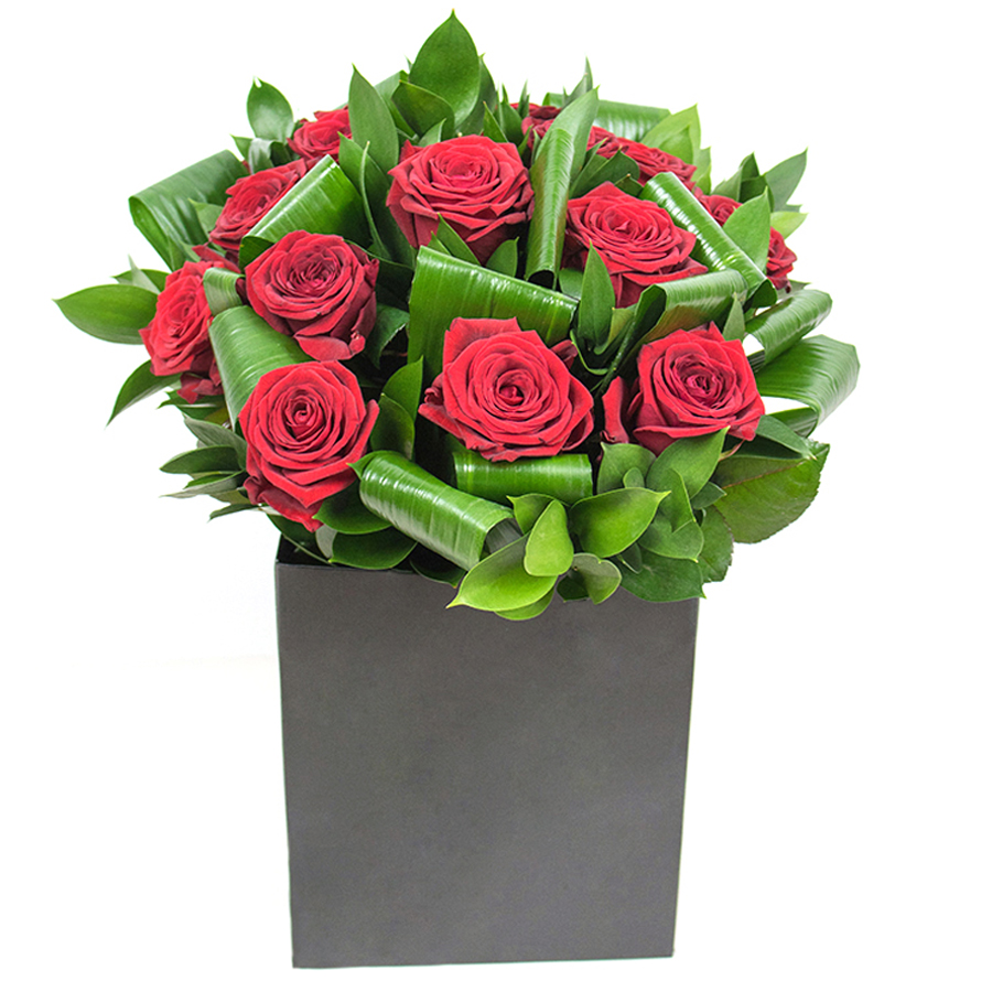 Fall in love with our stunning Romantic Red Rose Display, featuring enchanting red roses, vibrant aspidistra leaves, and stylish ruscus. Perfectly arranged to bring romance and elegance to any setting.