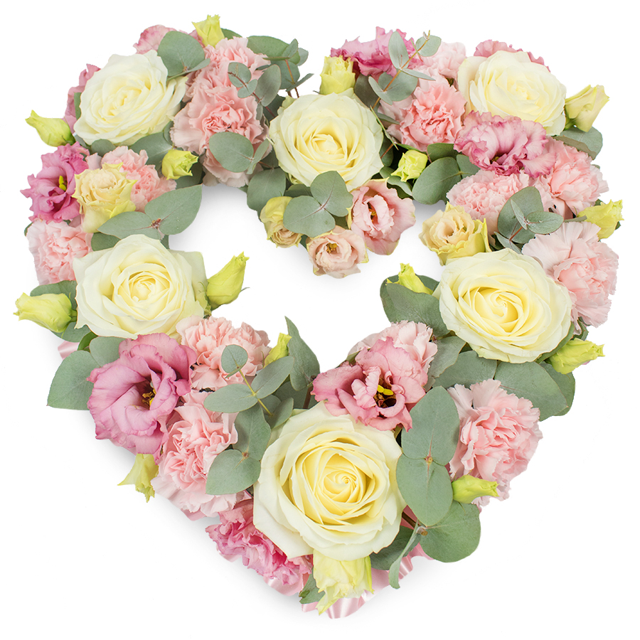 Convey your heartfelt emotions with our Luxurious Heart Tribute Floral Arrangement. This exquisite bouquet blends white roses, soft pink carnations, elegant pink lisianthus, and aromatic eucalyptus, meticulously arranged to create a stunning tribute to your loved one.